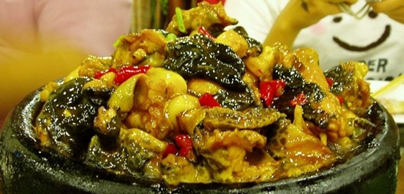 庐山石鸡是一种生长在阴涧岩壁洞穴中的麻皮青蛙。又名赤蛙、棘脑蛙,体呈赭色,前肢小,后肢强壮。因其肉质鲜嫩,肥美如鸡而得名。