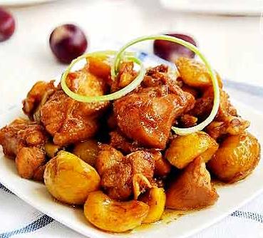 原料:鸡全腿1个、栗子200克、白糖一小匙、生抽、料酒各1大匙、老抽1小匙、盐适量、葱段、姜蒜片适量。