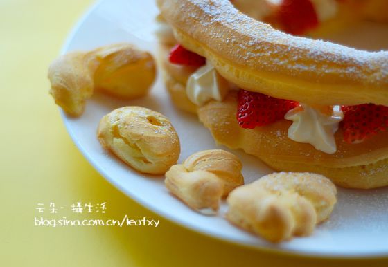做法:1、黄油切小块加入水、盐、细砂糖,加热至沸腾离火; 2、一次性倒入过筛的面粉,小火加热,快速搅拌至无粉状;3、加入少许蛋液,和面糊充分混合均匀后,再加入少许蛋液,混合均匀;直到面糊的稠度从勺上滑落形成倒三角形;4、用裱花嘴挤到烤盘上,用直形或花形裱花嘴都可,没有的话就小勺也行;5、将烤盘放入烤箱中,中层或中下层都可以,180度烤三十分钟左右即可。6、泡芙烤好后,放温室晾凉。这时候可以把淡奶油加白糖放厨师机里面打成奶油了; 7、草莓洗干净,切成小块;8、在泡芙三分之一处切开小口;9、挤入奶油; 10、最后放在草莓块即可。