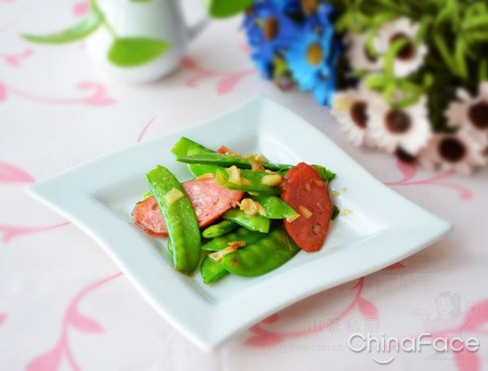 3、倒入荷兰豆继续翻炒;