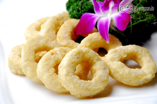 7、最后放面包糠里滚一下;8、锅中放油,烧至6、7成热,放入鱿鱼圈转中小火,炸至金黄色即可;