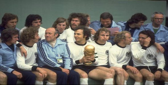 最后,真正的王道球队来了,同一拨人在同一年,同时将欧冠冠军和世界杯冠军包揽的真正王者球队!我们是称之为德国的拜仁,还是拜仁的德国呢?时光追溯回1974年,那一年的欧冠决赛,拜仁凭借重赛的四粒进球,以4比0横扫马竞捧杯(首战双方1-1打平,当时的规则是打平就择日重赛)。这支拜仁阵中首发11人一大半是西德国脚:泽普-迈尔、布莱特纳、施瓦岑贝克、贝肯鲍尔、赫内斯、盖德-穆勒和卡佩尔曼,一个半月之后,以上述拜仁七君子为核心组成的西德队同样在世界杯赛上横扫千军,最终捧起了大力神杯。