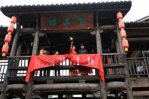 这时,新娘、新郎登上绣楼,倚着美人靠,开始抛“果籽”。游人们纷纷跳跃争抢新人抛出的果糖,此时,婚俗表演已达到了高潮。